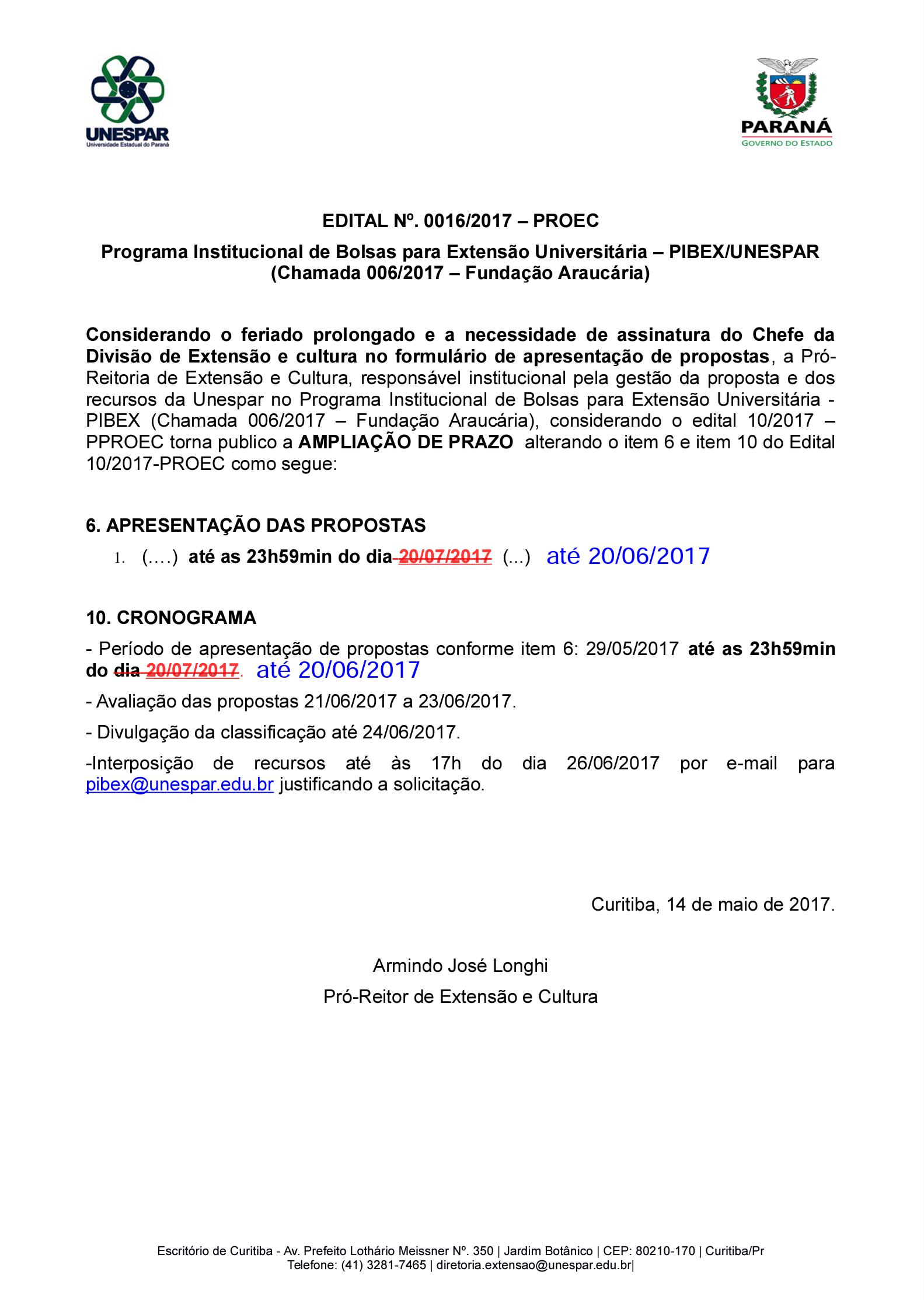 Edital 16/2017 - AMPLIAÇÃO DE PRAZO até 20/06/2017